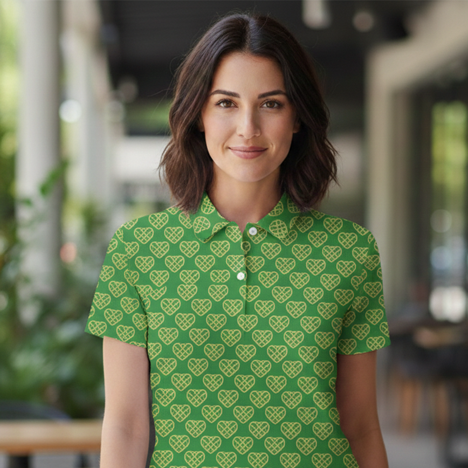 A premium women’s performance golf polo crafted with breathable, stretch-ready fabric. Featuring the signature Pryzmfit GeoHeart pattern in a striking green finish — built for comfort, movement, and standout style on and off the course.